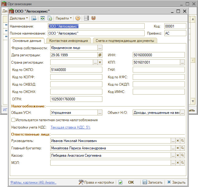 На вкладке "Счета и подтверждающие документы" обязательно должны быть заполнены расчетный счет и платежные реквизиты банка: